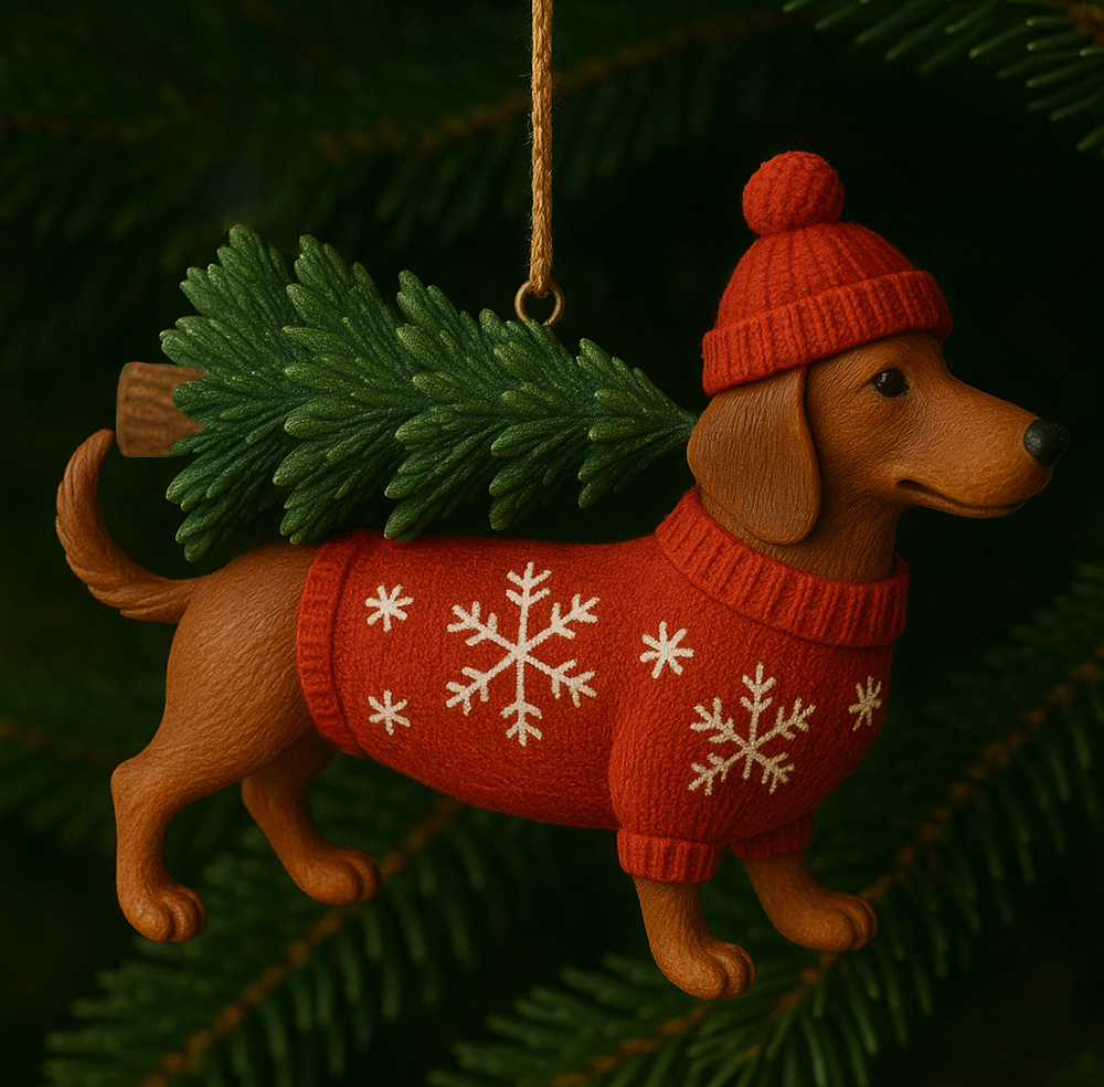 🐾🎄Add a touch of warmth and whimsy to your Christmas tree with this adorable dachshund ornament. Carrying a miniature evergreen tree on its back, it captures the true spirit of Christmas—love, giving, and family.