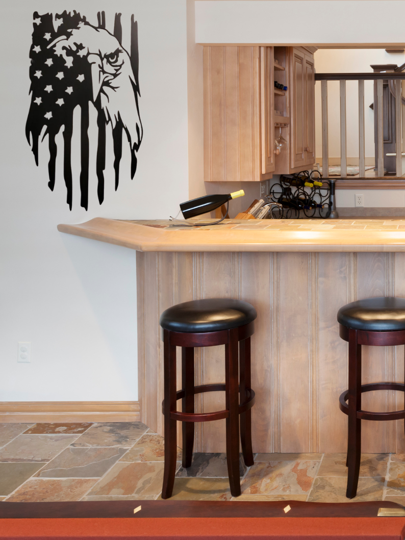 This Flag Eagle Metal Wall Art made with high-quality metal, this sign boasts a stunning and durable design perfect for any space. Show off your patriotic spirit and add a touch of American pride to your home or office decor. Laser cut from metal and then powder coated in black, this piece will last for many years to come.