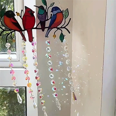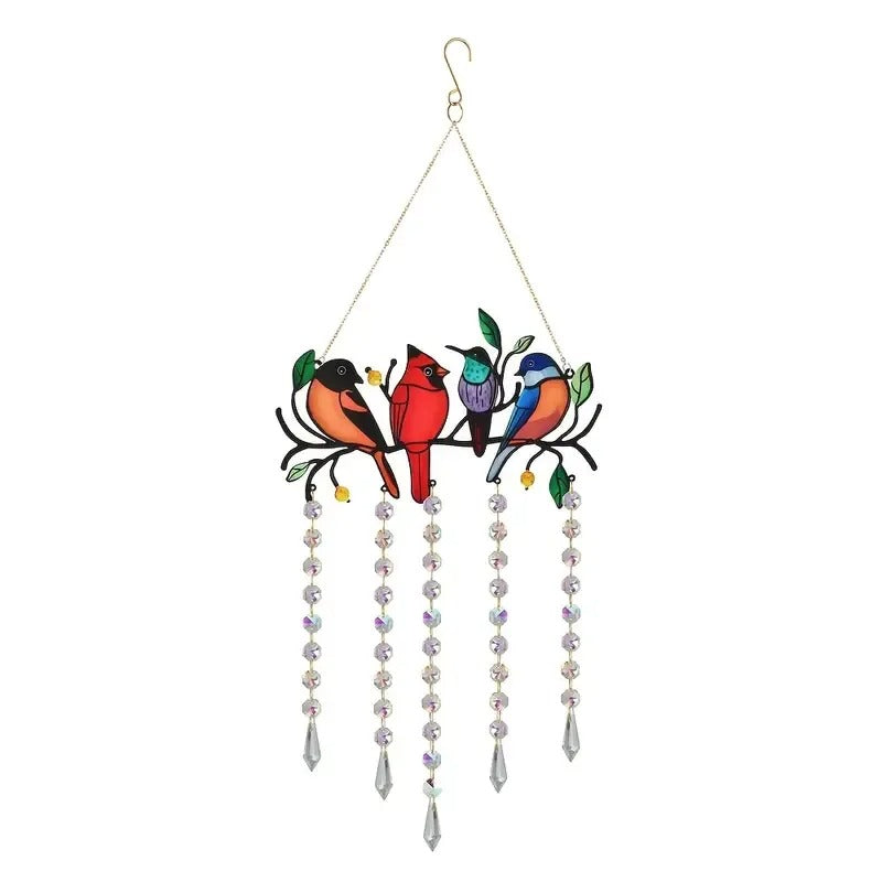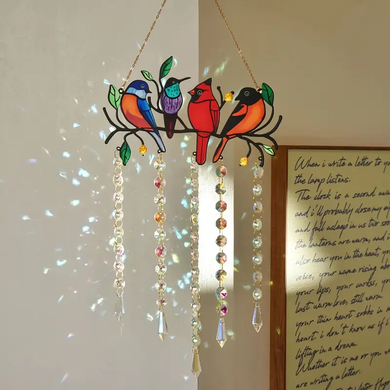 Exquisitely crafted, the main body features vibrantly colored hummingbirds perched among the branches, creating a vibrant image that looks as if ready to take flight. The accompanying crystal charms are translucent, reflecting brilliant light as light falls on them, creating a galaxy-like effect that adds a dreamy ambiance to any room.