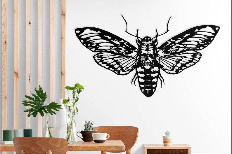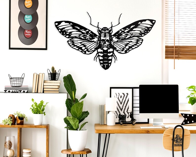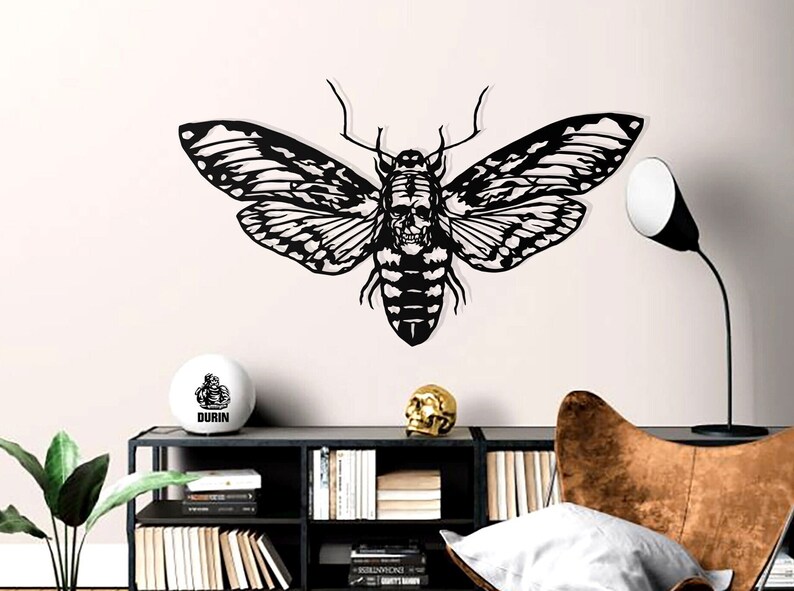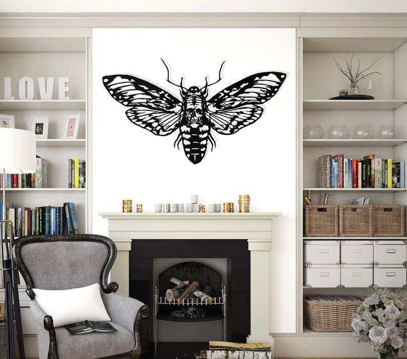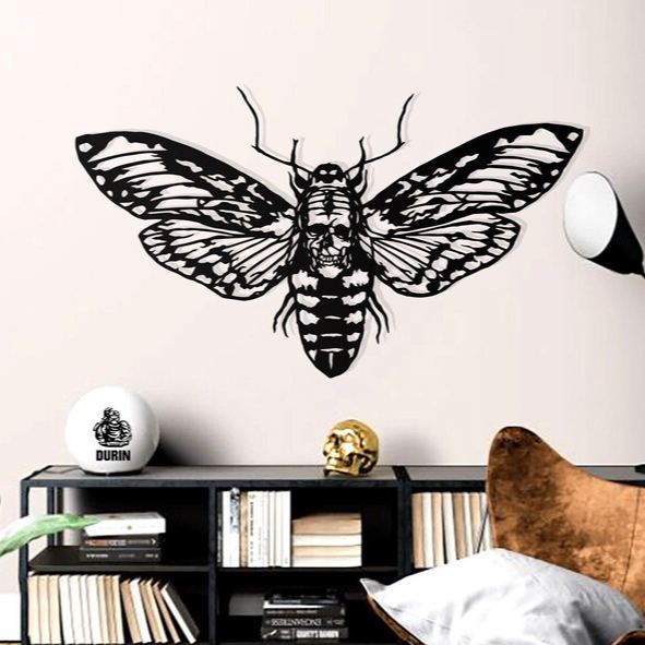 Enhance your home's charm and add a touch of whimsy with this Gothic Death's Head Moth Metal Wall Decoration. Can be placed on a door, shelf, fireplace mantel, or window sill.