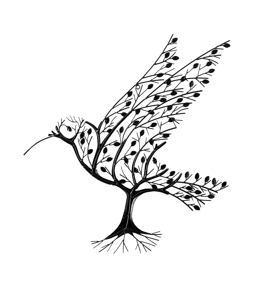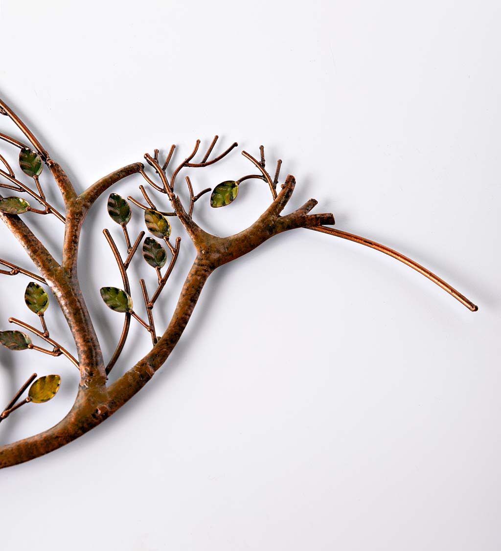 An intricate web of intertwining branches, leaves, and roots create a meaningful pattern on the wings and body of this Hummingbird with Branches Metal Wall Art.