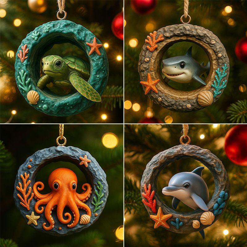 🌊✨ Bring the wonder of the ocean to your holiday tree! Each ornament in this charming collection features a beloved sea creature nestled in a coral reef ring—beautifully crafted with intricate details and festive colors.