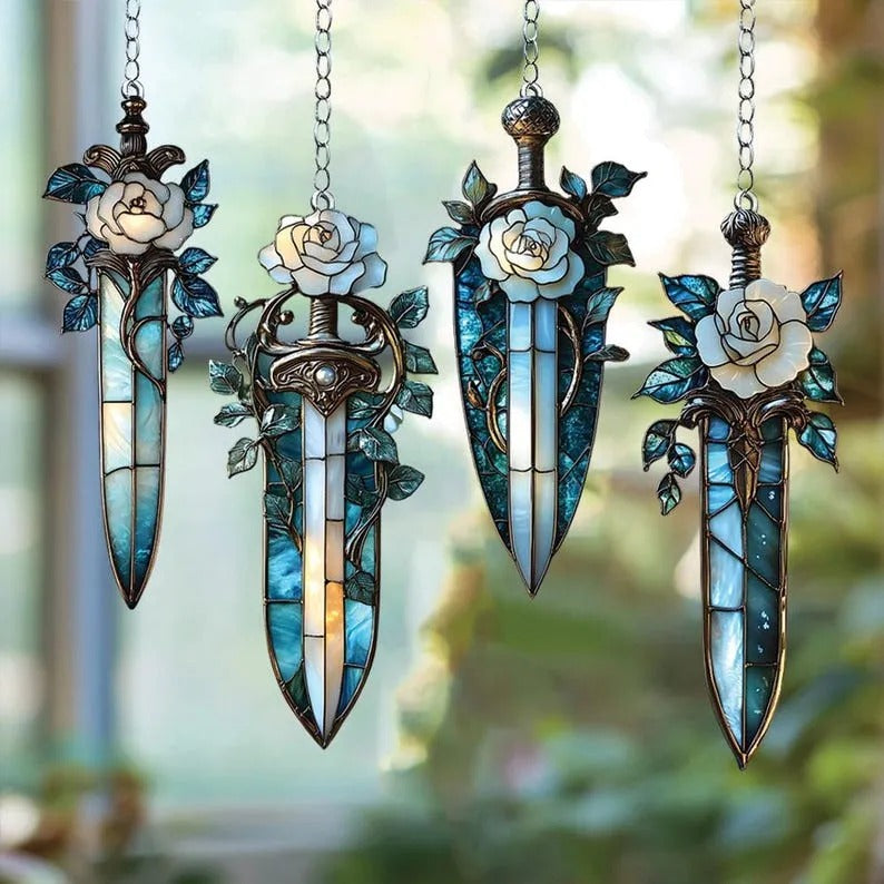 When the tenderness of a white rose meets the sharpness of a sword, this acrylic light catcher is born, creating a unique light and shadow aesthetic. Made from premium acrylic and meticulously crafted to resemble colored glass, the rose and sword are exquisitely shaped and three-dimensional, with rich details.